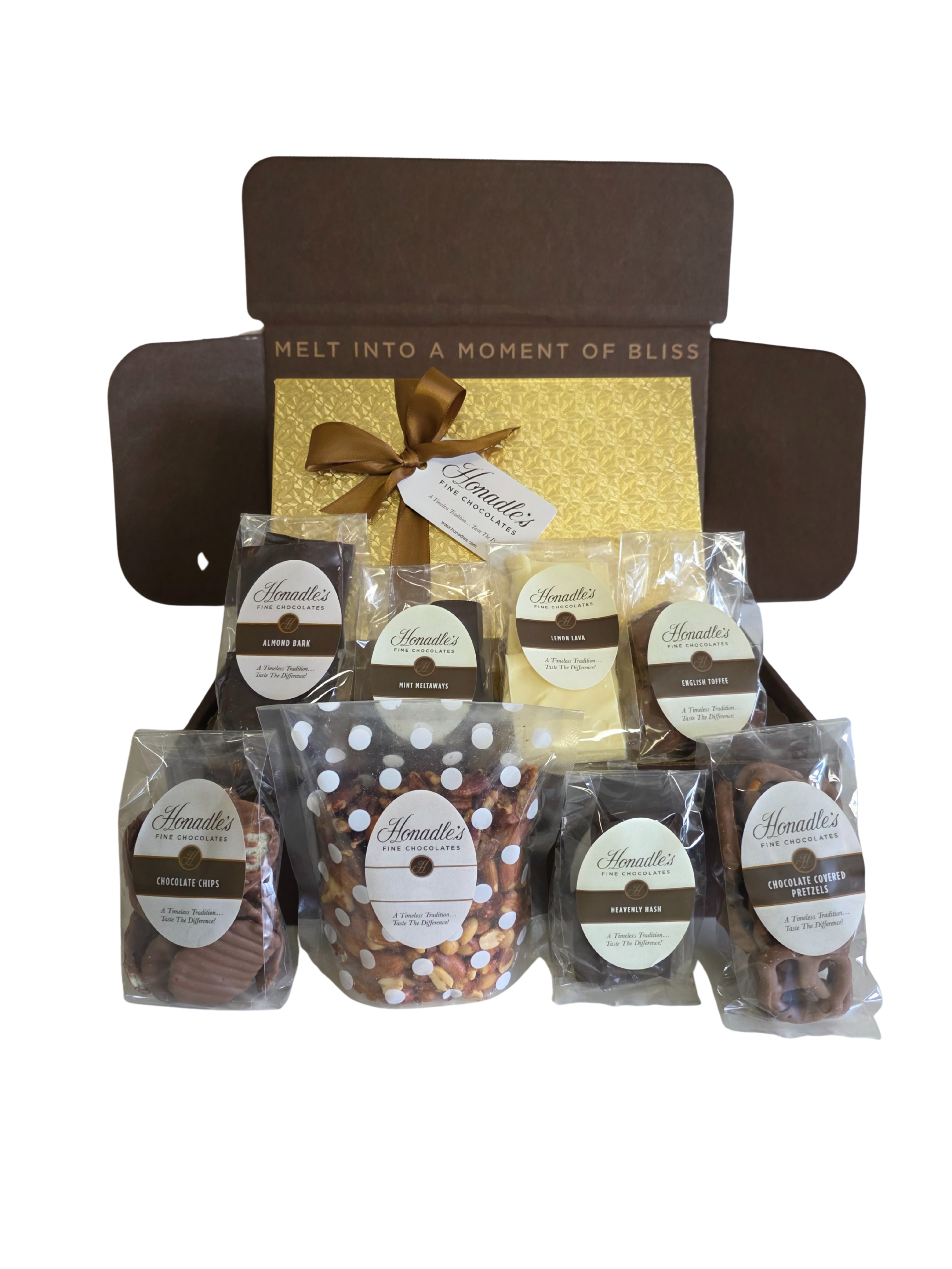 Indulge in a nostalgic, handcrafted favorite with the Becky Bar — a decadent blend of creamy peanut butter, roasted and salted cashews, and smooth, buttery caramel, all enrobed in our signature rich milk or dark chocolate. This irresistible treat is more than just candy — it’s a cherished family recipe passed down since the 1970s and named in honor of a Honadle family member.